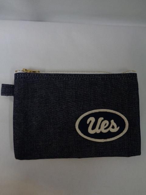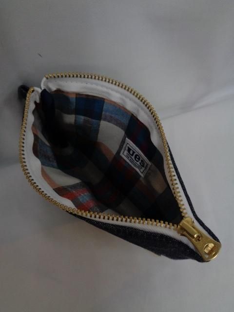 UESのデニムペンケースです。文房具だけでなく、携帯電話、カメラ、通帳やメモ帳等、色々入れることが出来ます。デニムの本体にはヴィンテージ感のあるワッペンが付き、ワッペンも含めて使い込む程に経年変化を刻み味わい深くなっていきます。ジッパーは真鍮のUNIVERSALジッパーを使用し、内側には裏地としてチェック生地が付いています。