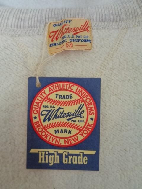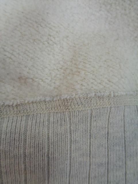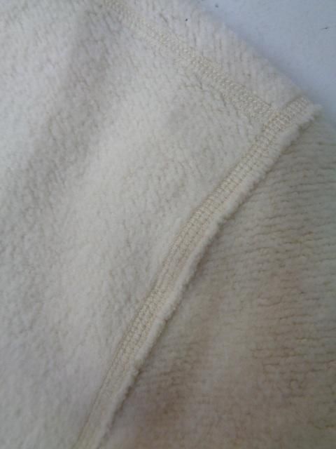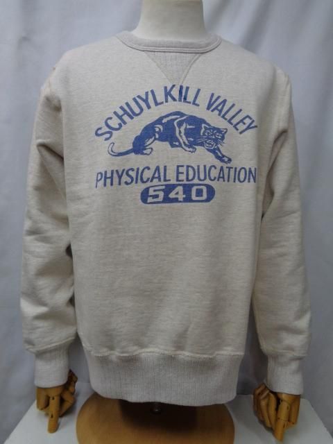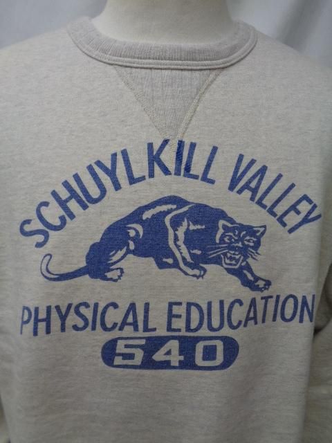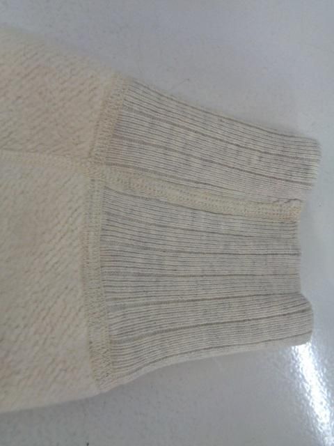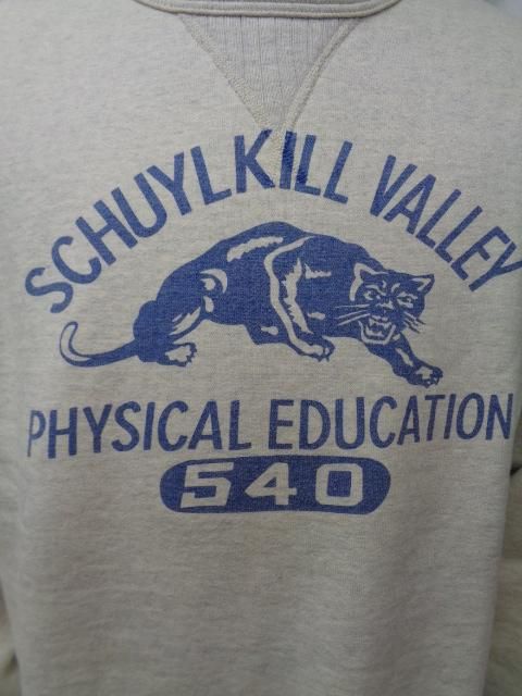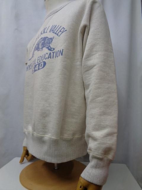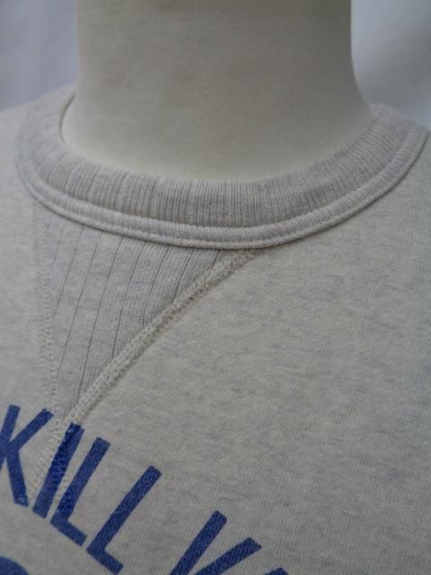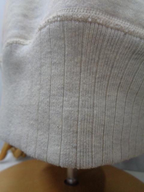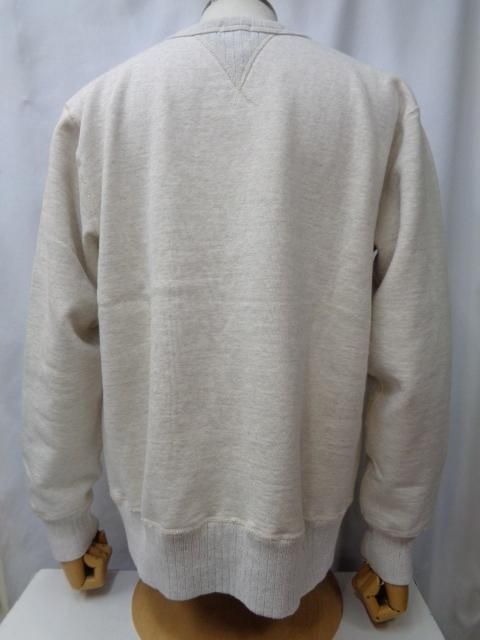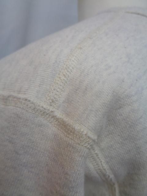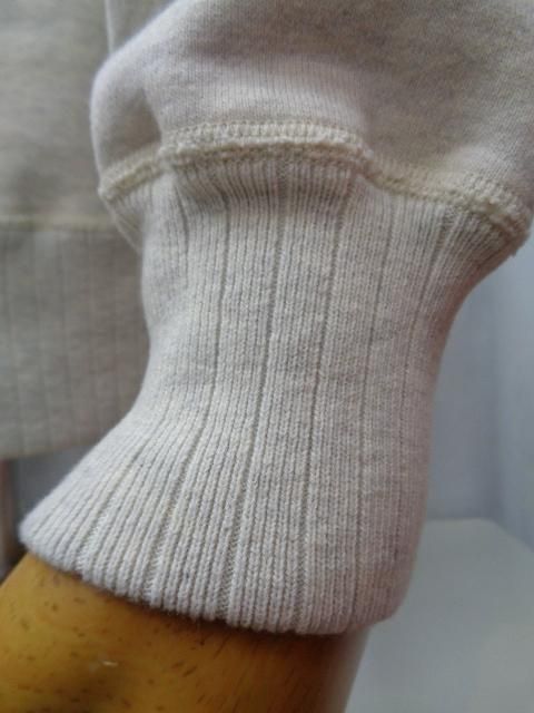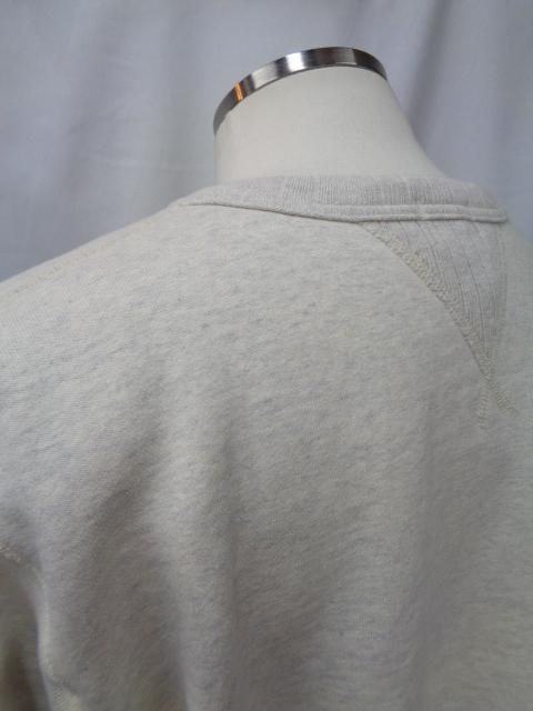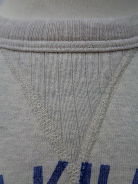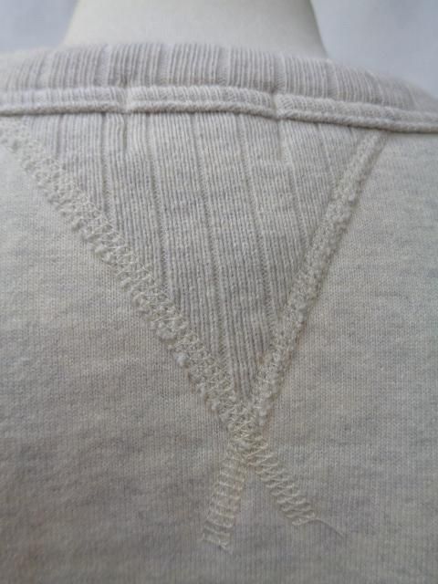 前後両方の首元にガゼットが付いた通称「両V」スウェット。表糸・中糸・裏糸を20/20/7の糸番手で編み立てたヘビーな生地を使用。身頃は丸胴、リブは10番手の糸で編み立てた針抜きリブで縫製は4本針のフラットシーマ。