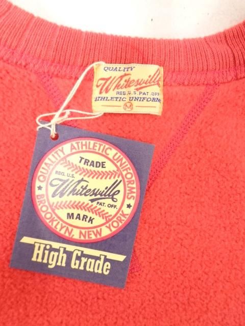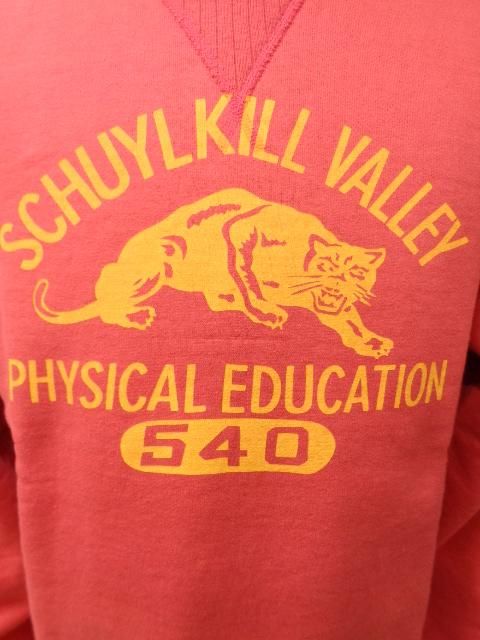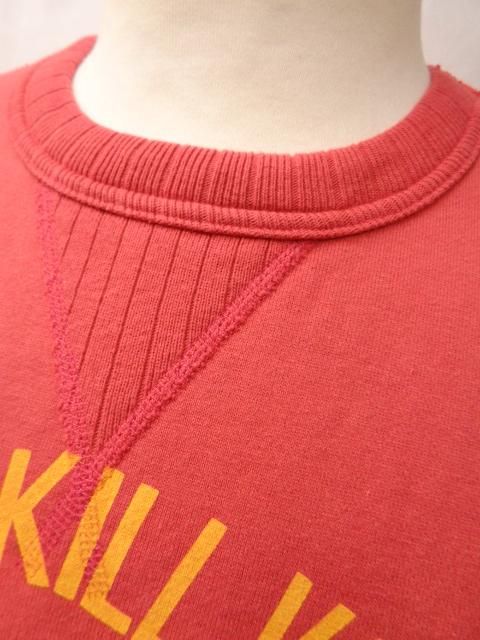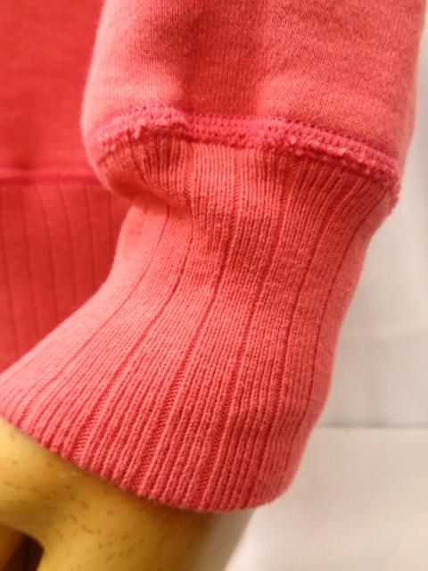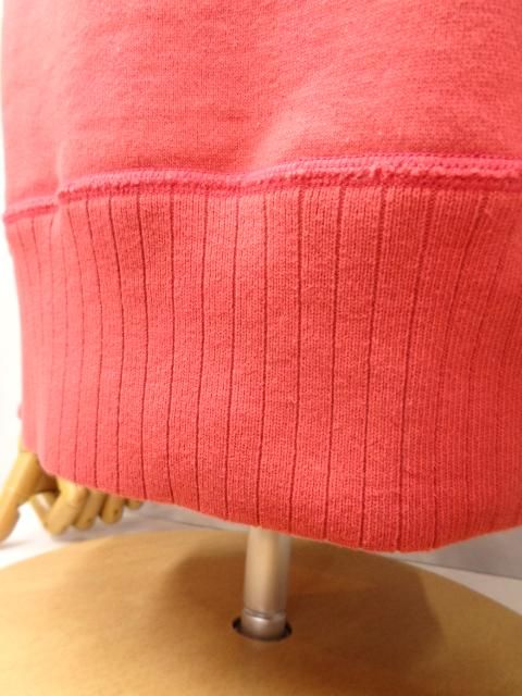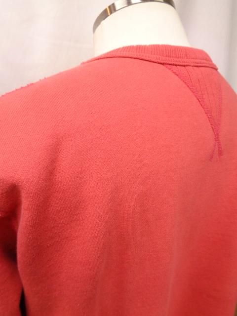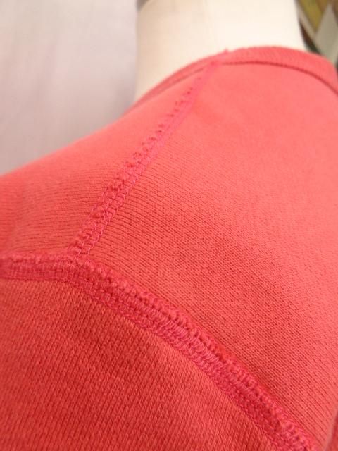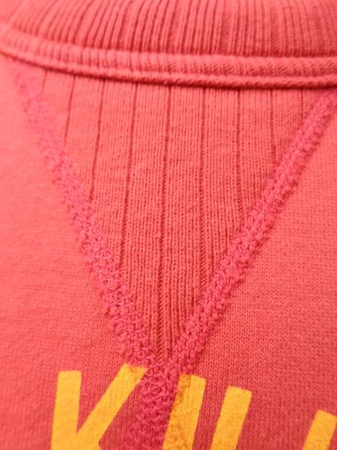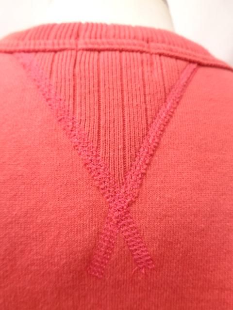 前後両方の首元にガゼットが付いた通称「両V」スウェット。表糸・中糸・裏糸を20/20/7の糸番手で編み立てたヘビーな生地を使用。身頃は丸胴、リブは10番手の糸で編み立てた針抜きリブで縫製は4本針のフラットシーマ。