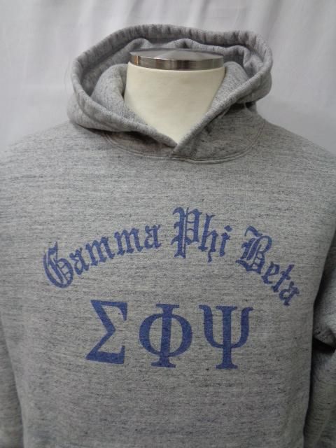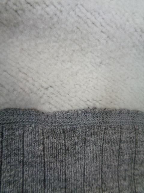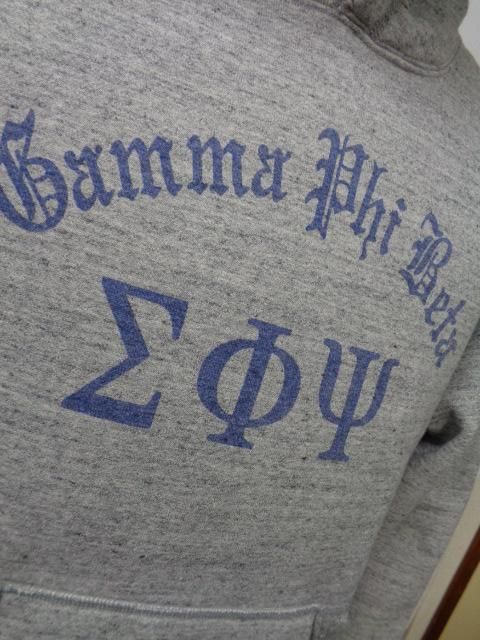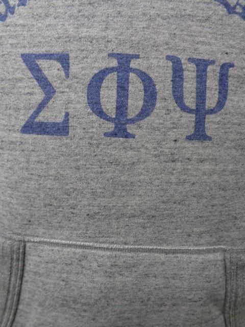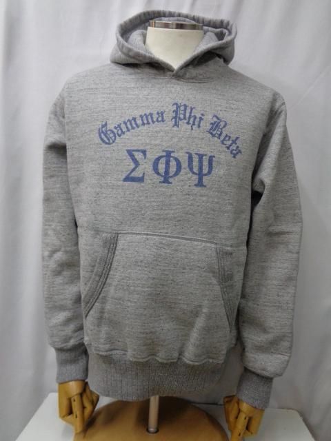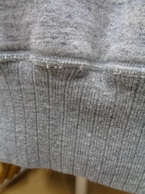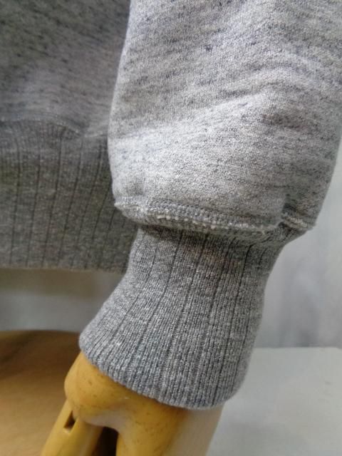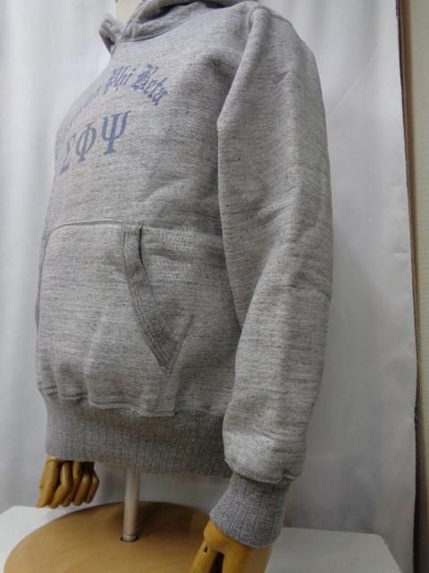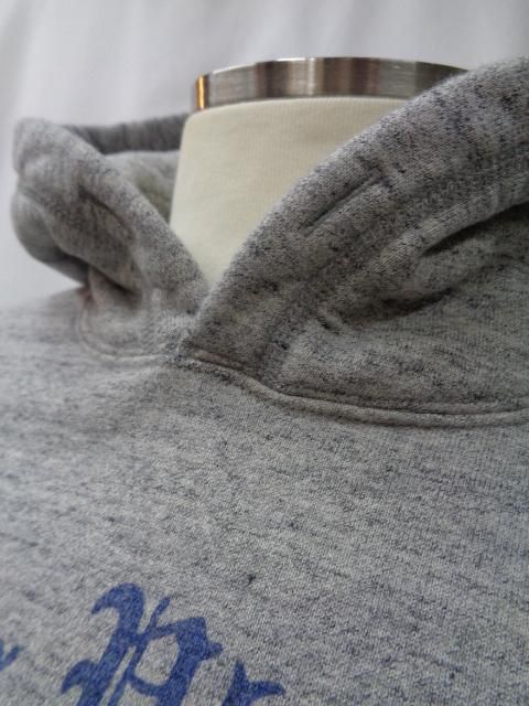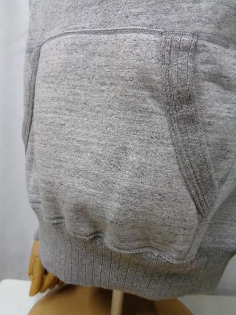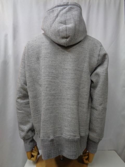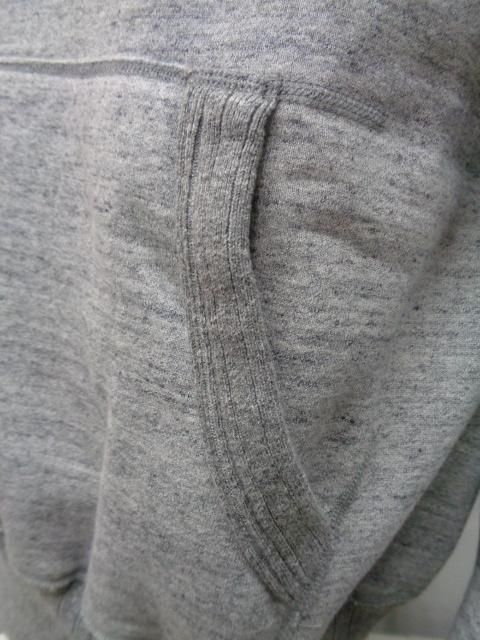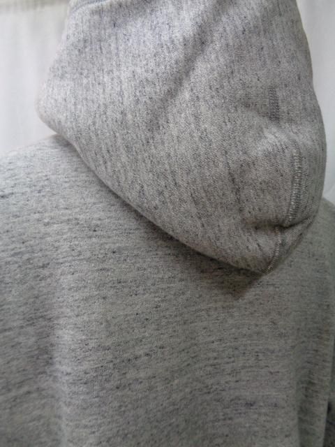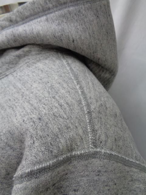 表糸・中糸・裏糸を20/20/7の糸番手で編み立てたヘビーな生地をフラットシーマミシンで仕立てたスウェットパーカ。フード部分は生地を2枚貼り合わせており、カンガルーポケットにパイピングされたリブが特徴的である。身頃は丸胴で、リブには10番手の糸を使った針抜きリブを使用。