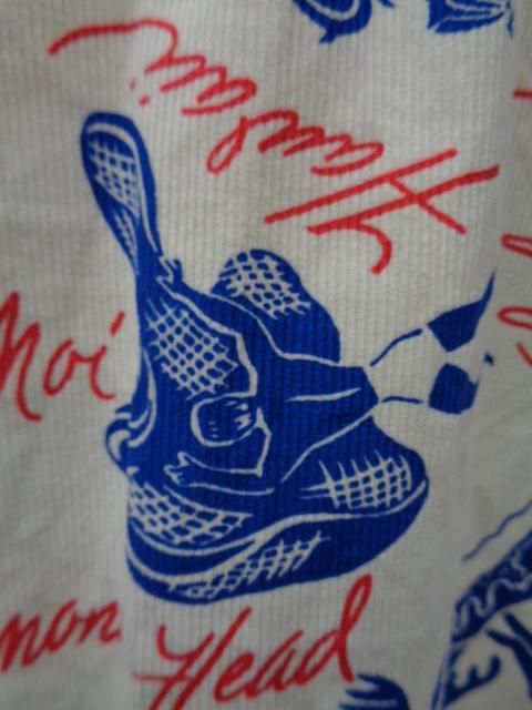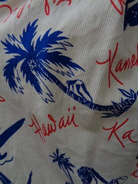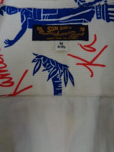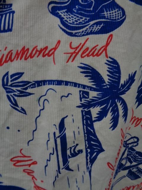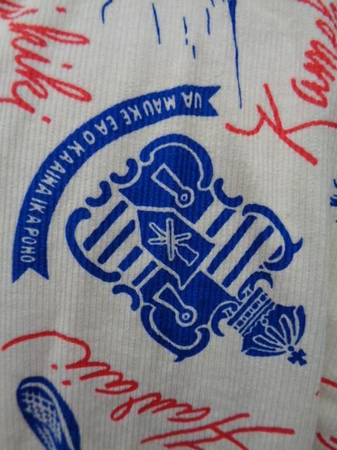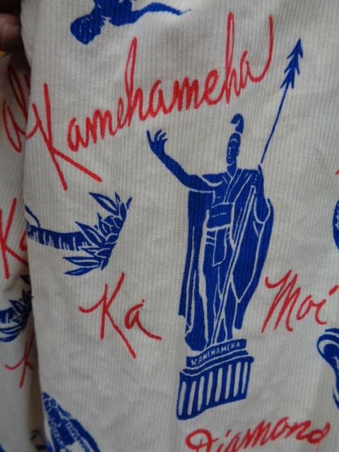 アロハシャツの歴史において重要な役割を果たした人物、エラリー・チャン。彼はエール大学を卒業後、1934年にホノルルに戻り、父親の経営する店舗を引き継いでキング・スミス・クロージアーズと改めた。そして1936年、エラリーの出願した「ALOHA」という名前が商標として認められると、アロハシャツという言葉は他店の広告から消えていく。兄のエラリーを支え、デザインを手掛けたのが妹のエセル・ラム・チャン。戦前の時代、和柄が主流であったアロハシャツのマーケットにおいて革新的とも言えるトロピカルデザインを発表し、人気を博したデザイナーである。クレストやカメハメハ像といったハワイのモチーフを組み合わせたこの柄も、戦前に製作された希少価値の高い作品。