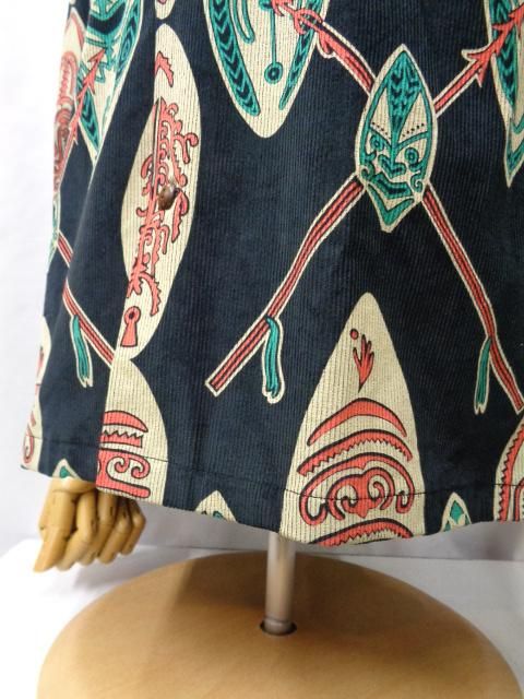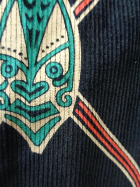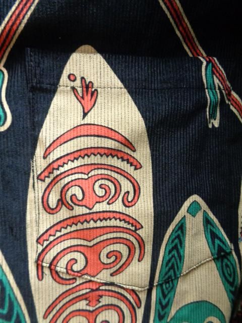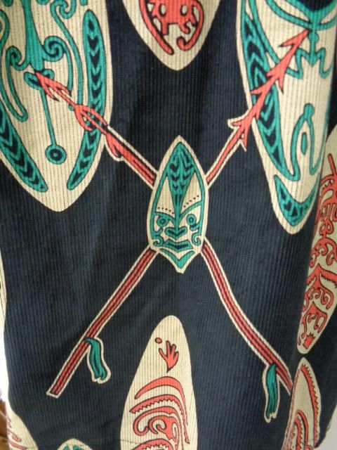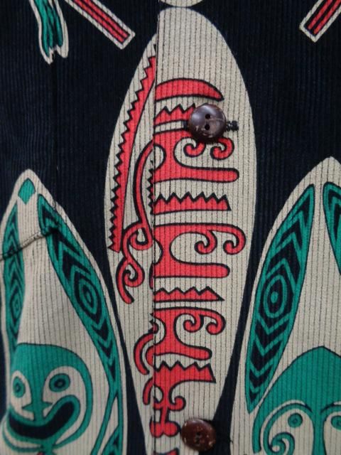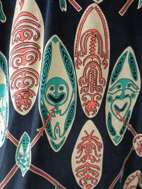 米国本土のブランドであるメイド・イン・カリフォルニアの作品。 モチーフにされているのはいわゆる典型的なポリネシアン柄(民族柄)で、伝統的な武器である槍と盾(ゴッド・シールド)が描かれている。