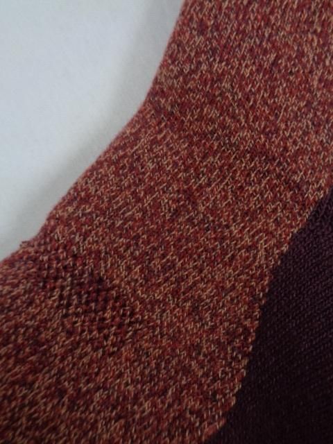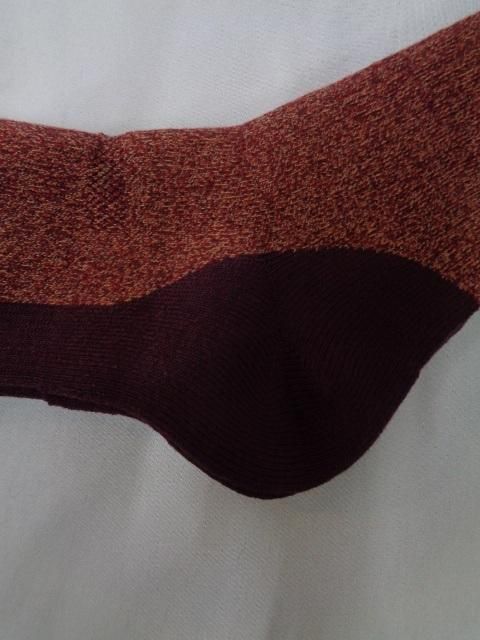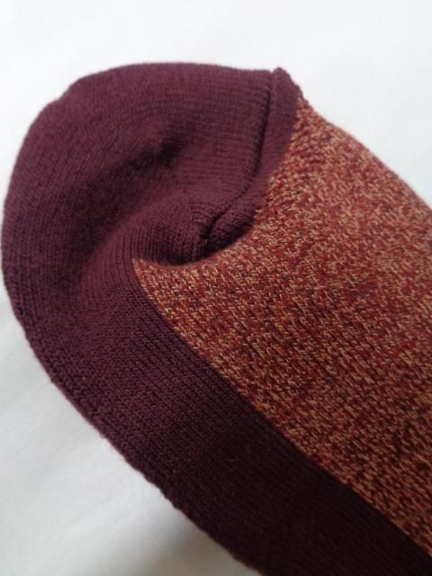 撚り杢糸と単色糸を使用し、色移りを防ぐ為つま先から踵までは単色の濃い糸を選定。