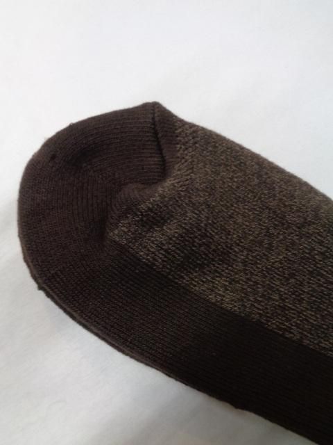 撚り杢糸と単色糸を使用し、色移りを防ぐ為つま先から踵までは単色の濃い糸を選定。