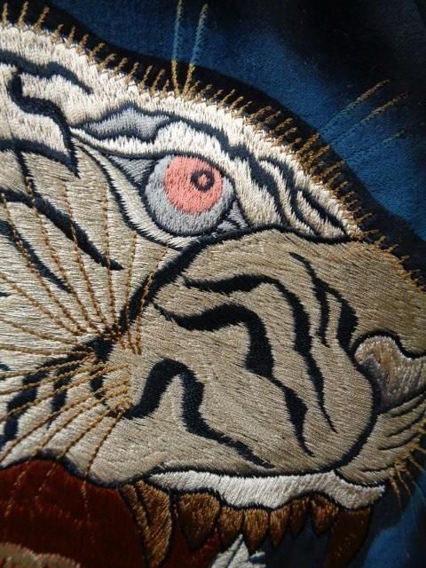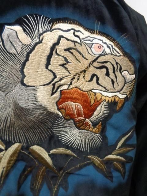 東洋エンタープライズの60周年を記念し、ヴィンテージではウルトラレアとされるステンシルが施されたスーベニアジャケットを復刻。当時、スカジャンと同様に横振り刺繍が施されたクッションカバーも米兵の土産物として好まれ、そのバリエーションとして刺繍とステンシルを組み合わせたものが存在する。しかし、ジャケットとして仕立てられたものは極めて珍しく、まさしくスペシャルな一着。刺繍は1950年代中期の「タイガーヘッド」と呼ばれる絵柄で、白虎の顔の周りにはブルーのステンシルが噴かれ、黒い別珍から浮き出てくるかのような迫力。うねる鬣は何度も針足を変えながら一本一本丁寧に描かれ、血走った瞳は赤い刺繍糸で強調されている。