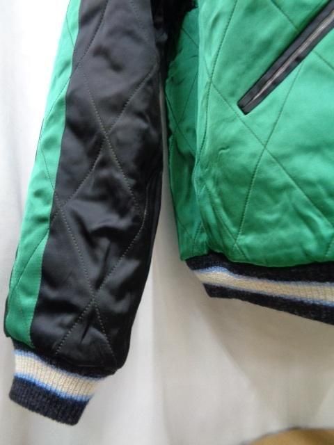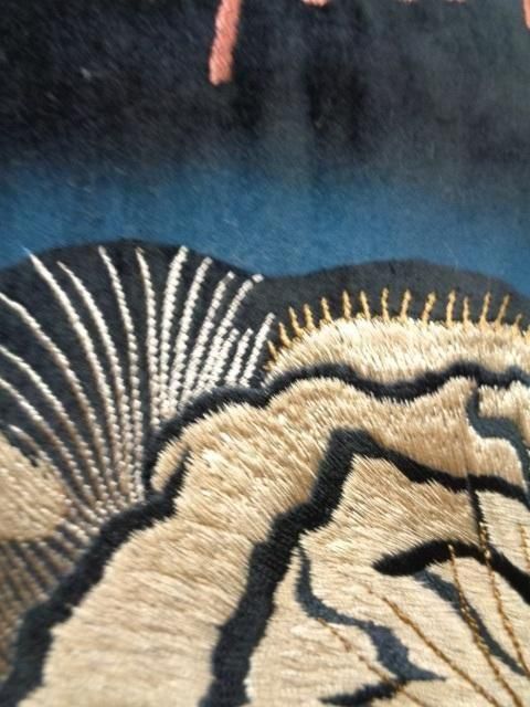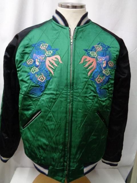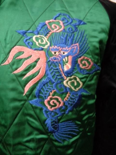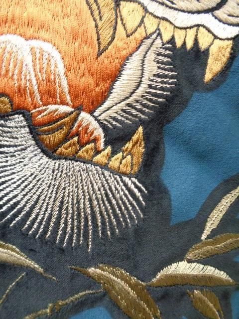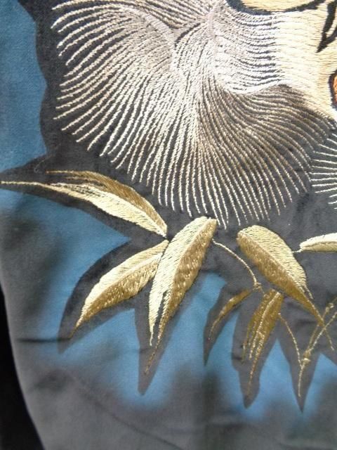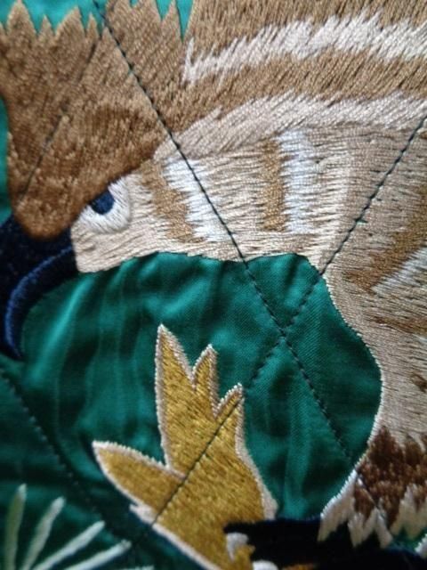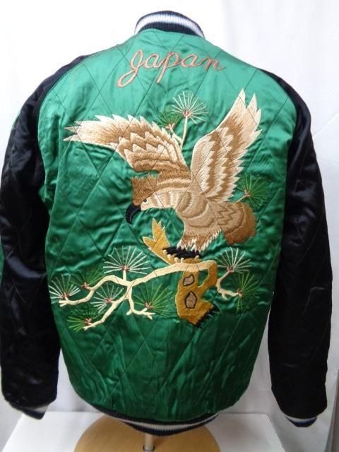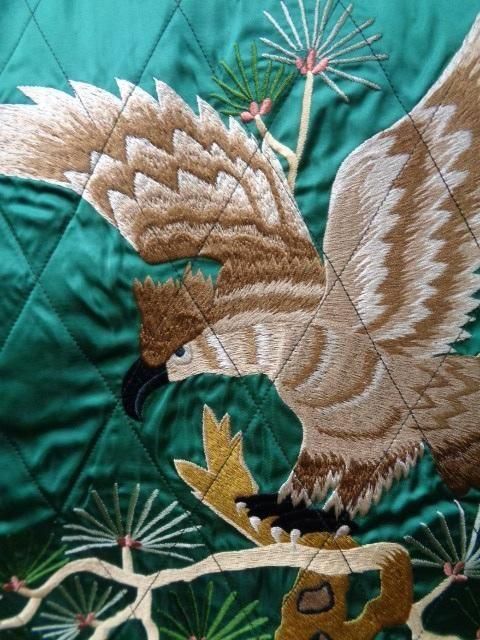 リバーシブル面は、身頃よりも袖下の色が濃い「逆配色」。鮮やかなグリーンのボディに描かれるのは、翼を広げた鷲、そして立派な枝ぶりの松の木。盆栽などにも通じる、力強い樹形を鑑賞して愛でる日本の美が表現されている。当時も今も、職人の卓越した技術がなければ生み出せない圧巻の作品。