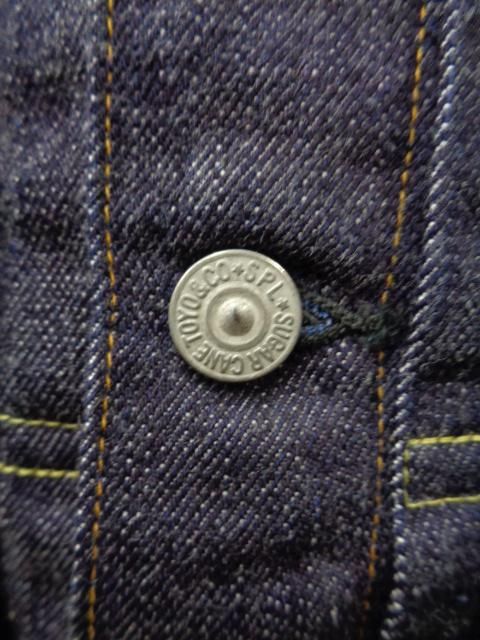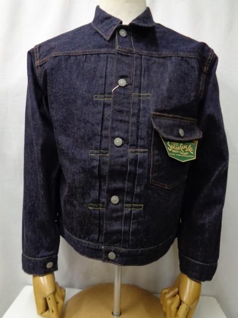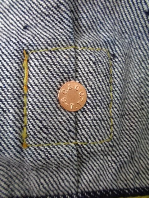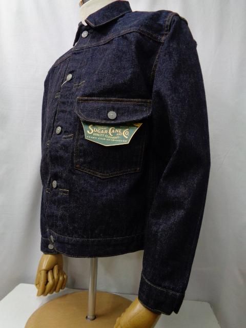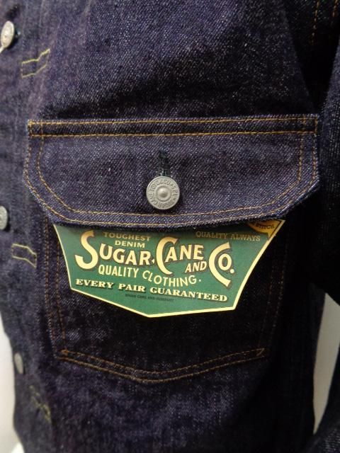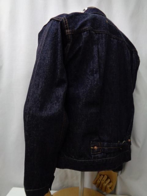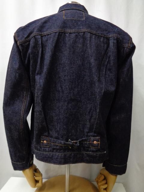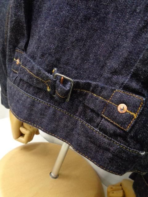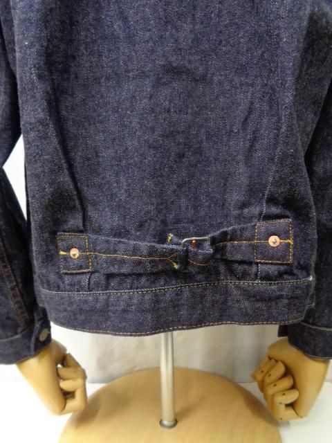 フロントや袖口のタックボタンが、パンツのフライ用のスモールボタンからトップ用のフルサイズに変わって間もない時代の1936年モデル・デニムブラウス。経糸7番×緯糸7番の未熟な紡績のムラ糸を使用した13.5oz.セルビッジデニムに、戦前らしいオレンジがメインのステッチワークが映えている。左胸ポケットのフラップの裏側にはライトオンスデニムを使用し、前身頃の身返し端にはセルビッジが見られる。