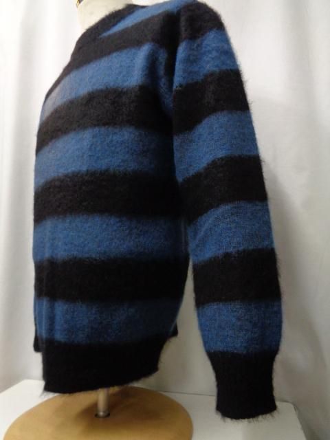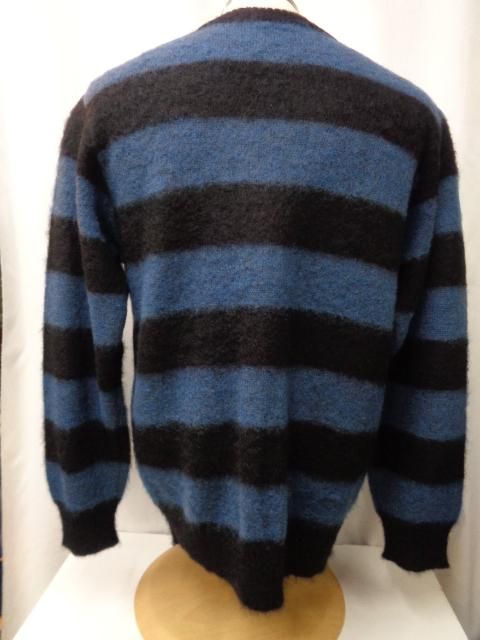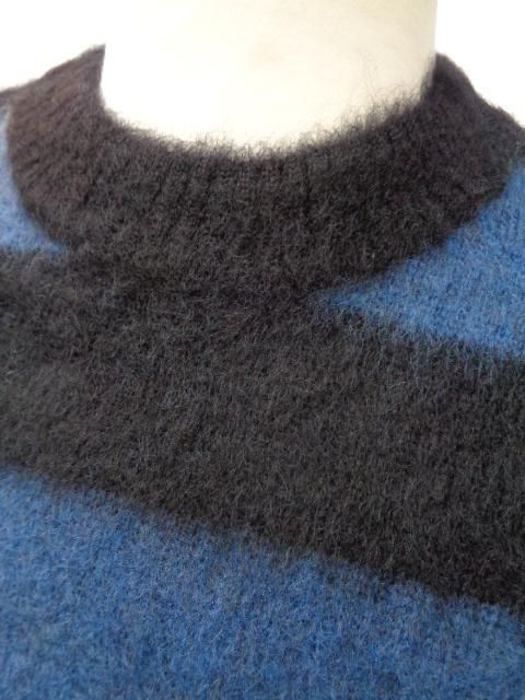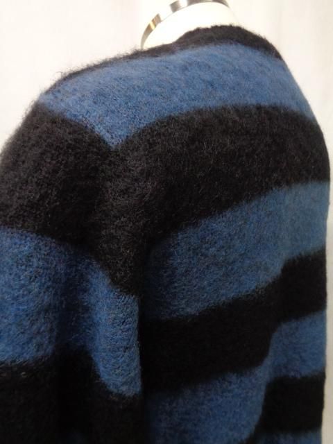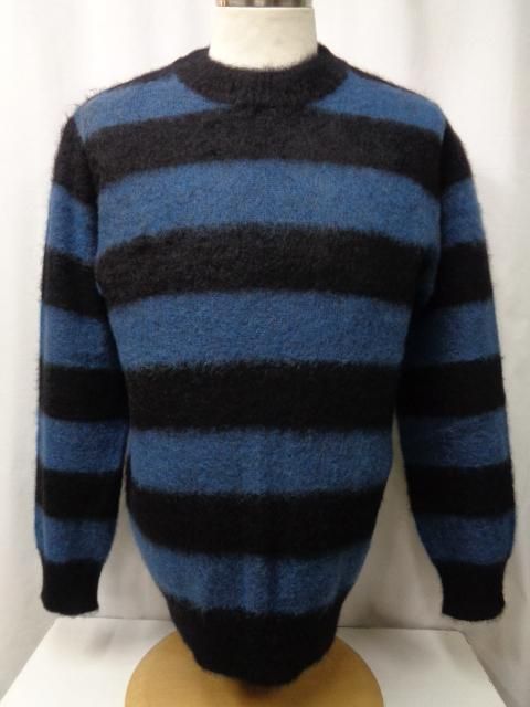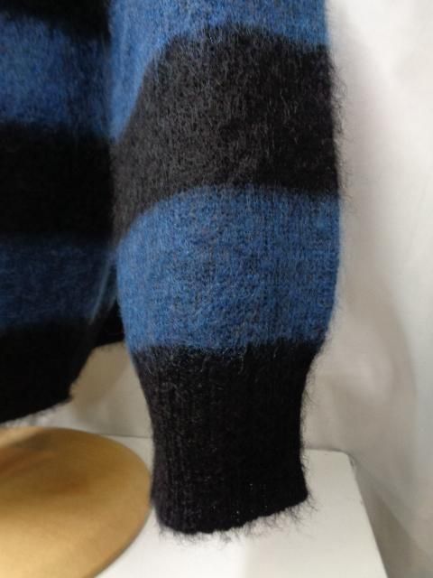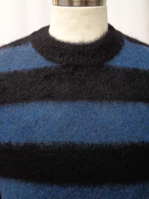 2025年のコレクションテーマは「THE CREAM OF THE CACHE」。JELADO秘蔵のコレクションから選び抜かれたヴィンテージアイテムを再現し、最上のコレクションを展開していきます。 かつて見つけ次第買い付けていたモヘアのプルオーバーニットも、今では当時の3倍以上の相場に高騰。そんな希少なクルーネックのモヘアニットを、今回新たに製作しました。キッドモヘアよりも細い原毛を使用し、7ゲージのダブルジャガードで編み立てた後、ローラーでしっかり起毛をかけることで、毛足の長い風合いを実現。モヘアの混率が高いため、チクチクせずTシャツの上からでも快適に着用できます。首元は広すぎないクルーネック仕様で、どんなスタイリングにも取り入れやすいデザイン。今回の「BLUE BERRY」は、ヴィンテージでもなかなか見つからない太柄のボーダーを、個性的なカラーリングで表現しました。デニムやブラックデニムとの相性も抜群な一枚です。